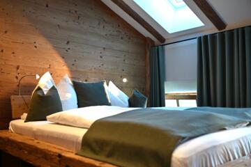 Die Ferienwohnung Schaf, im 2. Stock des alten Bauernhauses gelegen, besticht durch ihre offene Bauweise und den geschmackvollen Einsatz traditioneller Baustoffe. Mit viel Liebe zum Detail wurde aus Altholz in Kombination mit anderen bewährten Materialien eine besonders wohnliche Atmosphäre geschaffen: elegant und gemütlich zugleich. Durchdachte Lichteffekte und architektonische Feinheiten verleihen der Wohnung den letzten Schliff. Hier erlebst du Urlaub auf dem Bauernhof zum Wohlfühlen und Genießen.