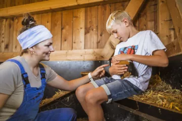 Mit jeder handvoll Futter lernt ihr die Tiere besser kennen und erfahrt spannende Geschichten über ihren Alltag und ihre Bedürfnisse. Die Kinder dürfen selbst mit anpacken. Während die Jungbäuerin Rebecca mit viel Geduld jede Frage beantwortet und erklärt wie wichtig der achtsame Umgang mit den Tieren ist, stupsen die Kälbern schon mal an und freuen sich auf ihren Milcheimer. Für die Kleinen wird das Füttern schnell zu einem Highlight, und auch die Eltern genießen die ländliche Ruhe und die Freude, die von den Tieren ausgeht.