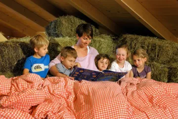 Mutige kleine Abenteurer (und ihre Eltern) können auf der Empore direkt über den Tieren übernachten. Vom gemütlichen Heubett aus lässt sich das Treiben der Tiere beobachten, während Mama oder Papa mit einer Gute-Nacht-Geschichte für den perfekten Abschluss des Tages sorgen.