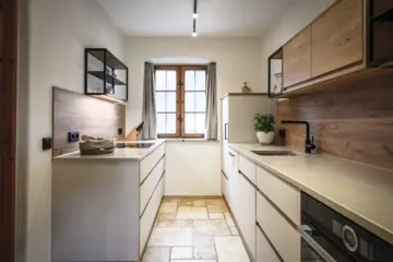 - Küche: Bora-Kochfeld, Kühlschrank, Geschirrspüler, Kaffeemaschine, Wasserkocher und Toaster